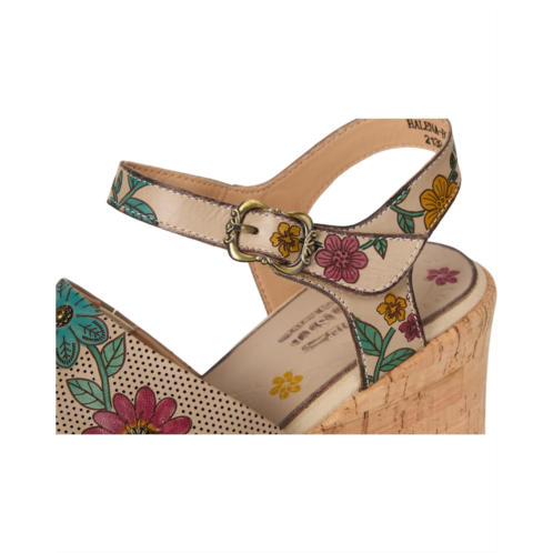 - Slip into the L'Artiste by Spring Step Halena platform sandal and let your style shine, whether you're dressing up for a special occasion or simply enjoying a day in the sun. With its attention to detail and comfortable cork sole, the HALENA will have you feeling confident and comfortable from morning to night. Crafted from leather upper, faux leather lining, and insole, this pair of sandals features open round toe, block heel, adjustable hook-and-loop ankle strap and inside stretch gore on the toe strap for a customized fit, and hand painted flowers on the footbed for special attention to detail.