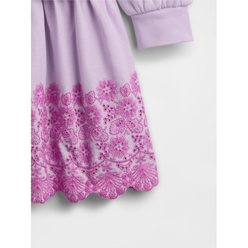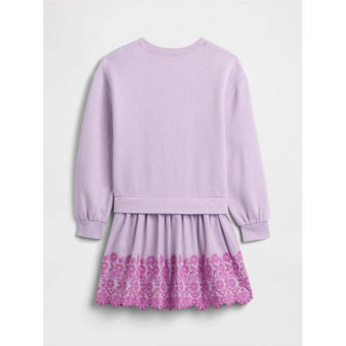 - Comfy fleece sweatshirt, smooth woven skirt.