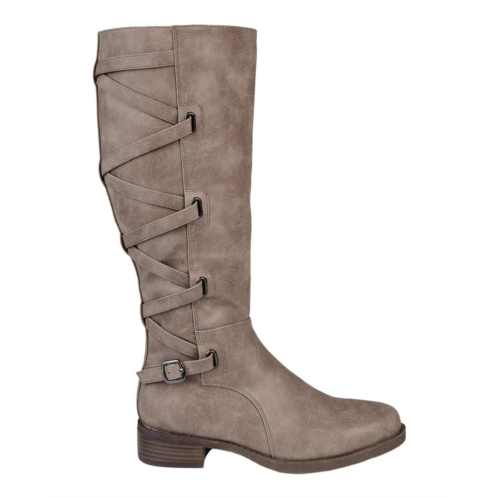 - If you love a good riding boot, then you'll love the Carly boot by Journee Collection. This boot has such a different look to it with the zigzag lace detail. It's so quirky and can easily spice up any winter outfit. This boot also features an almond toe shape and a distressed coloring.