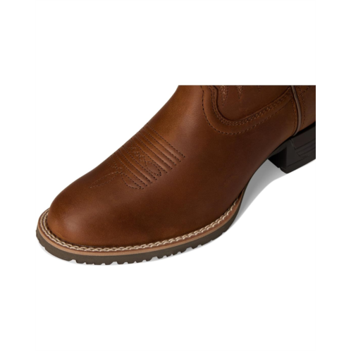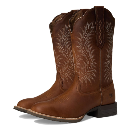- The Ariat Hybrid Ranchward is built for rugged versatility, blending traditional Western styling with modern performance features. It has a stacked heel, and a W toe shape for a classic silhouette. The boot is equipped with Shock Shield technology to absorb heel impact and reduce fatigue, while ATS technology provides ergonomic support on uneven terrain. A Duratread outsole ensures maximum wear resistance, and the removable Energy Max comfort insole helps reduce foot pressure and enhance support. StretchFit panels under the pull tabs offer a wider calf fit, and the boot is finished with a four-row stitch pattern and embroidery for authentic Western flair.