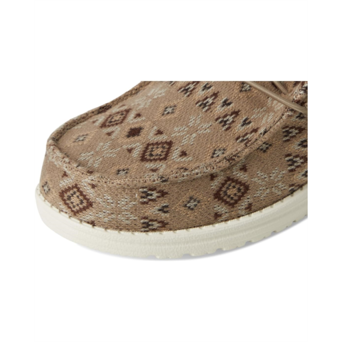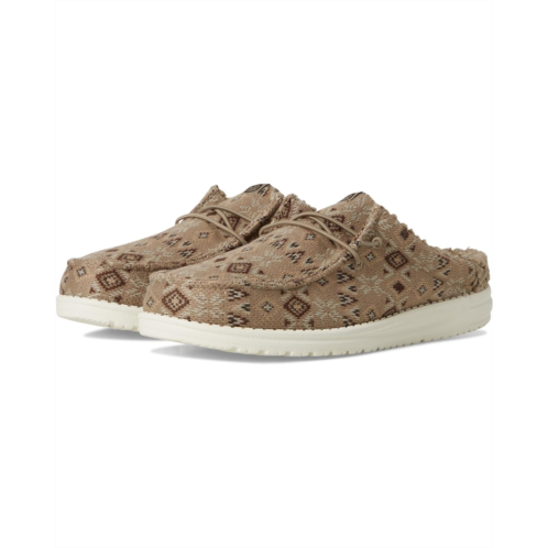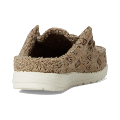 - The Hey Dude Wally Slip Sweater shoes are designed for cozy, cold-weather comfort with effortless style. Featuring a soft polyester fleece lining, they keep your feet warm while maintaining a relaxed, travel-ready vibe. The easy-on slip system with elastic fixed laces ensures quick wear, and the raised back heel edge adds extra support.