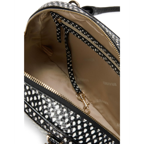 - The Brahmin Angie satchel purse is a modern dome satchel expertly crafted in lightweight croc-embossed Alden Road leather with softness that lets the silhouette come to life. The two-way zippered top closure allows easy access to your essentials, while carefully constructed interior pockets make organization effortless. The long rolled handles are comfortable to wear over the shoulder. Its adjustable crossbody strap ensures versatile styling. This leather purse is designed with an exterior back slide-in pocket, an interior kangaroo pocket, and an interior zippered pocket.