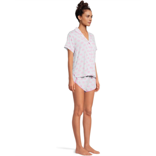 Enjoy a peaceful sleep at night feeling the utmost comfort in the P.J. Salvage Lovely Dreams PJ Set. The classic-fit pj top features a notch lapel collar, short sleeves, one patch pocket on the left chest, and allover pink kiss pattern. The matching shorts feature an elasticated waistband with a drawstring and a short silhouette with a curved hem.