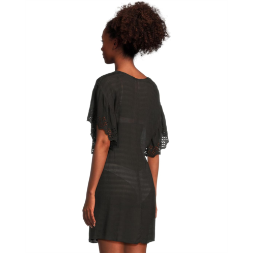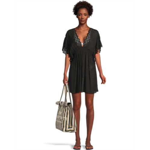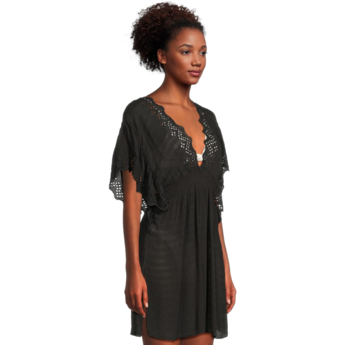Don the gorgeous BECCA by Rebecca Virtue Barbados Tunic at your next beach vacation and amaze them all with its sexy plunge neckline and flutter sleeves that come with side slit openings. The pullover style tunic highlights embroidered eyelet scallop edges with a smocked elasticized front and an uneven hemline.