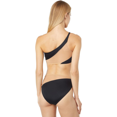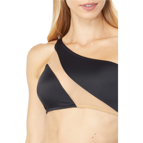 Swimsuit top with one shoulder strap and a mesh illusion panel across the chest and back.