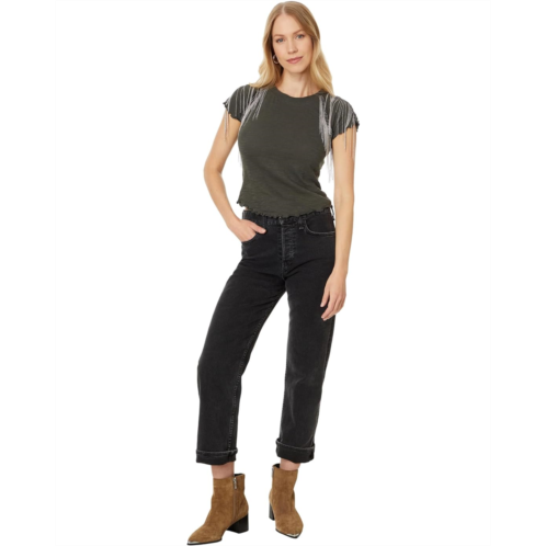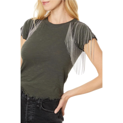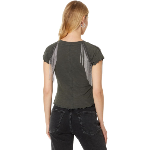 Slay a stylish everyday look by wearing the Free People Bang Bang Tee. The pull-on style tee has a boat neckline, short sleeves, and a rounded bottom hemline. The fitted, classic design with lettucekorea trim complements your curves and works well with a trouser, jeans, or skirts. The top features an exaggerated beaded fringe on the shoulders for added edge.