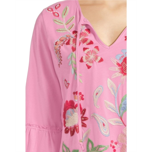 Crafted for style and breathable comfort, the Johnny Was Ruffle Sleeve T-shirt is the perfect addition to your casual wardrobe. The pull-on style tee features a V-neckline with tie-up detail, three-fourth ruffle sleeves, a straight hem, and a vibrant embroidery allover for added splash of color.