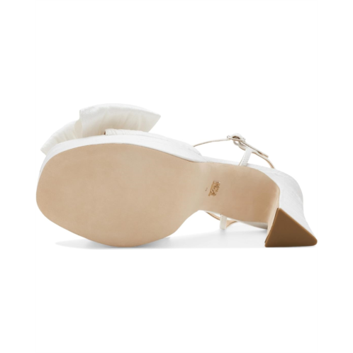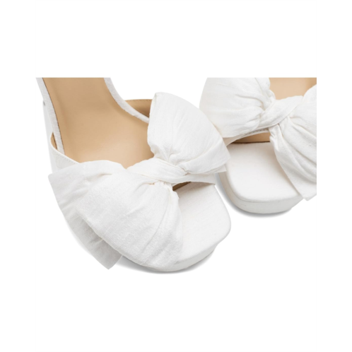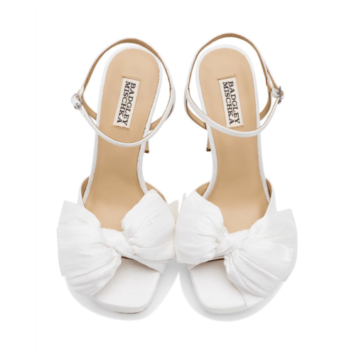 배즐리 미슈카 - The Badgley Mischka Oliva is a statement-making heel that blends glamor with comfort. Designed with an open square toe and oversized bow accent, it brings sophistication to any ensemble. The architectural block heel paired with a supportive platform offers stability and ease. Crafted with a silk upper and leather outsole, the Oliva delivers a luxurious finish, while the buckle adjustable ankle strap closure ensures a secure fit.