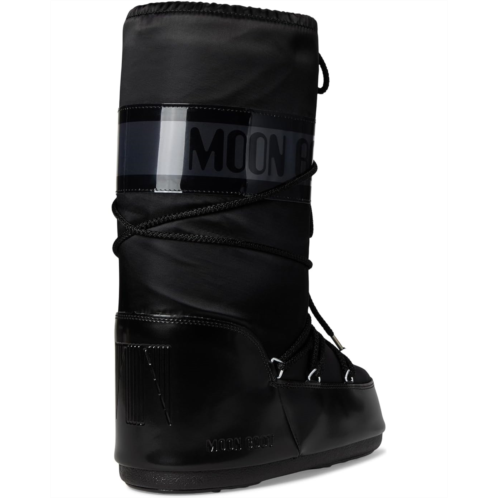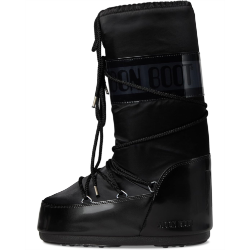 - All that glitters is not gold... sometimes it's glossy satin MOON BOOT Icon Glance boots. Inspired by the 1969 lunar landing, these pull-on boots riff on high-technology astronaut gear. They feature all the hallmarks of the original style: they're insulated, fitted with a lightweight thermoplastic midsole, and feature suction pads on the rubber tread outsole that offer serious ground control. The polyester upper has bungee laces for a secure fit. They are made of a foam insole and polyester lining. These calf-high boots are perfect to glam up your cold-weather outfits.