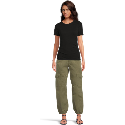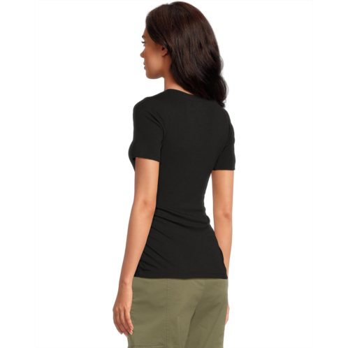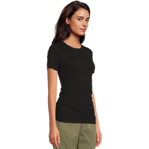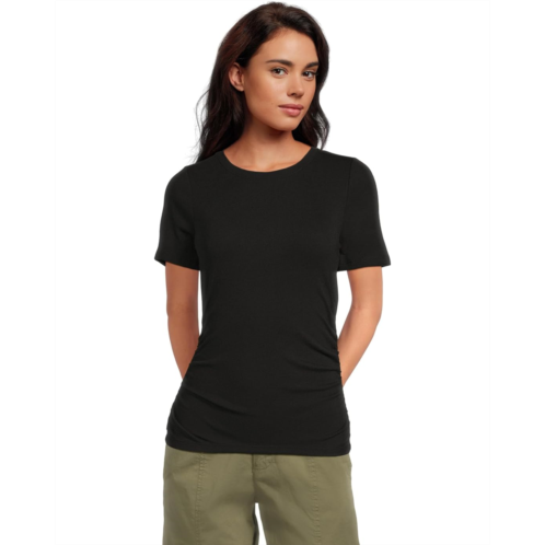 Give a touch of effortless styling to your look wearing the Sanctuary Dressy Twist Tee. It features crew neckline, short butterfly sleeves, side ruching details, and asymmetrical hemline.