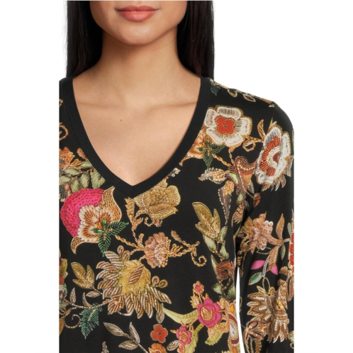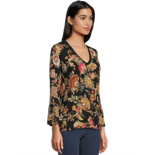 Chic and versatile, the Johnny Was The Janie Favorite V-neck Flute Sleeve Tee- Lowri blouse features a lively mix of florals in warm tones with vibrant-hued pops against a classic backdrop. With its easy fit and three-quarter sleeves, it's a perfect go-to for effortless day-to-night style.