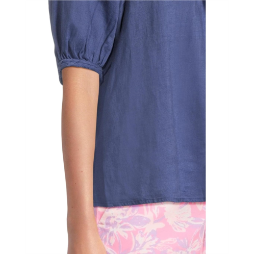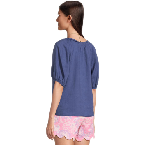 The Lilly Pulitzer Calais Short Sleeve Top is a breezy, easy fit blouse crafted from linen for lightweight comfort. It features a round neckline with braid detailing and short puffy sleeves, creating a relaxed silhouette that skims the body without clinging.