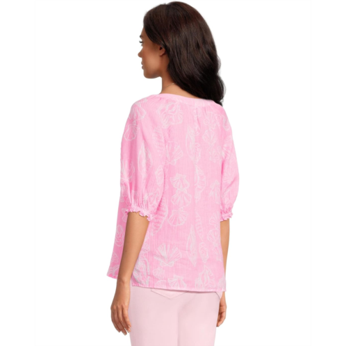 The Lilly Pulitzer Caprina Top is an easy fit blouse crafted from Seacoast Linen for lightweight comfort and effortless style. It features a notch neckline, elbow-length sleeves, a pullover silhouette, and a vented hem that adds playful movement.