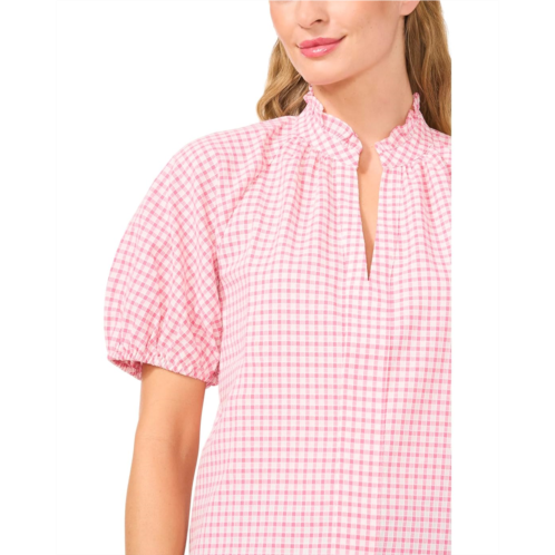 The charming CeCe Raglan Sleeves Ruffled Split Neck Blouse combines raglan short sleeves with a ruffled split neck for a unique twist. Crafted with gingham dobby fabric, the pull-on style top features an exquisite checkered print and is finished with a straight hem. Its relaxed fit and soft fabric make it a go-to choice for laid-back weekends or casual Fridays at the office