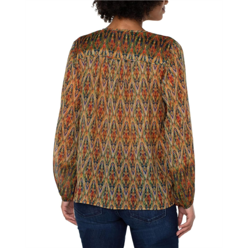 Acquire the exquisite blend of fashionable and comfort look wearing Liverpool Long Sleeve Double Layer Tie Front Woven Blouse. It features split neckline with tie detailing on the front, straight hemline, and allover iconic print.