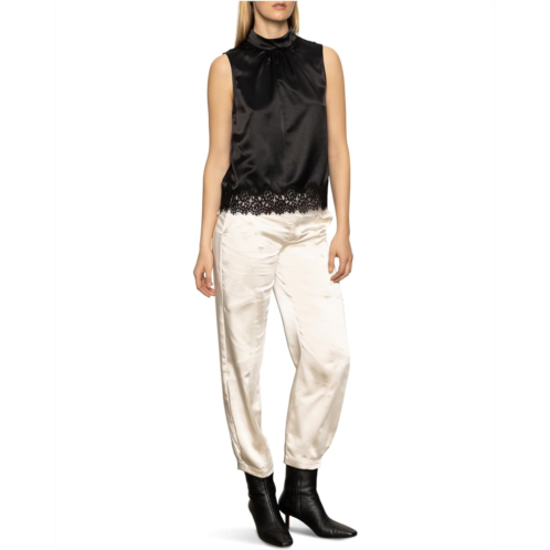 No matter the occasion, stay flawless in the Sanctuary Late Night Satin Tank. Featuring a mock neckline in a sleeveless design, this top offers a back button-and-loop closure with delicate lace trim detailing along the hemline. Pair it perfectly with your favorite skirt or pants and heels for a night out on the town!