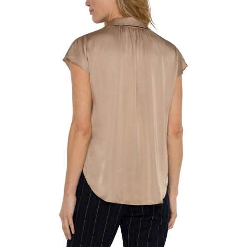 Channel a radiant glow wearing the Liverpool Los Angeles Dolman Sleeve Collared Button Front Satin Blouse. It features a collared neckline, short dolman sleeves, button-down front placket, and curved hem for a flattering look.