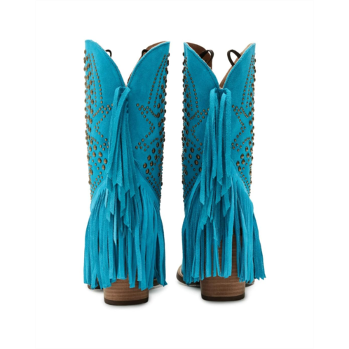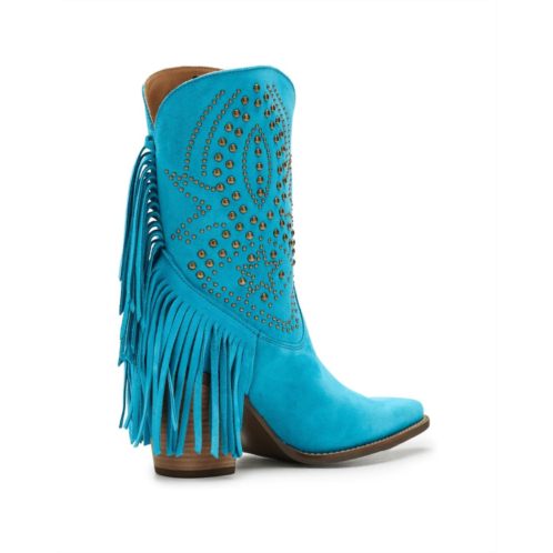 - Own every moment in the Dingo Star Power boot, a dazzling fusion of bold attitude and effortless Western charm. Designed with a luxe suede upper and smooth polyester lining, it delivers comfort that lasts as long as your spotlight. The cushy foam insole and durable rubber outsole keep every step steady, while the iconic snip toe adds a touch of classic cowgirl finesse. Slip into the calf-high, pull-on silhouette and watch the magic unfold as edgy studs, shimmering stars, and playful fringe cascade over the heel, creating movement, sparkle, and pure show-stopping energy.