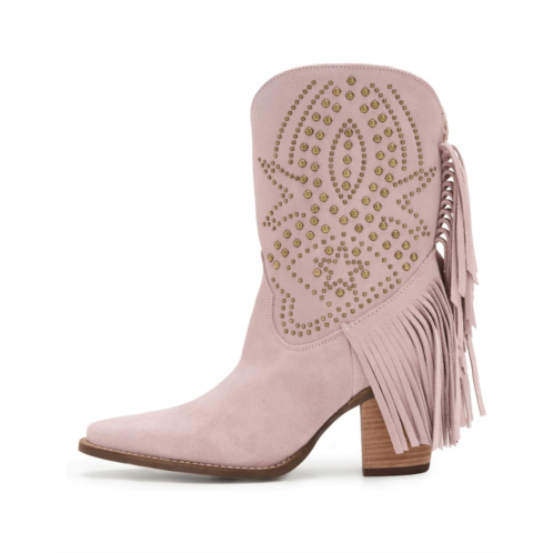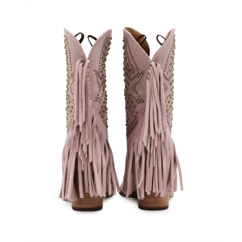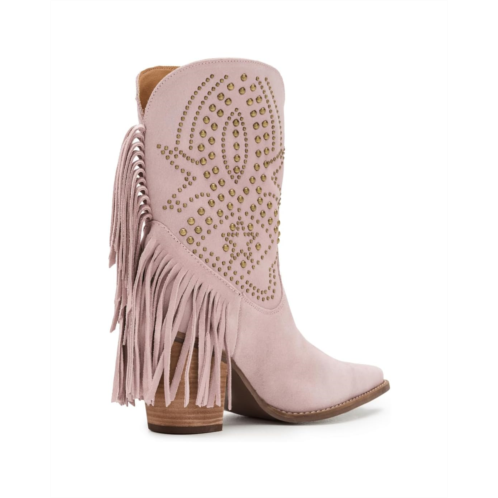 - Own every moment in the Dingo Star Power boot, a dazzling fusion of bold attitude and effortless Western charm. Designed with a luxe suede upper and smooth polyester lining, it delivers comfort that lasts as long as your spotlight. The cushy foam insole and durable rubber outsole keep every step steady, while the iconic snip toe adds a touch of classic cowgirl finesse. Slip into the calf-high, pull-on silhouette and watch the magic unfold as edgy studs, shimmering stars, and playful fringe cascade over the heel, creating movement, sparkle, and pure show-stopping energy.