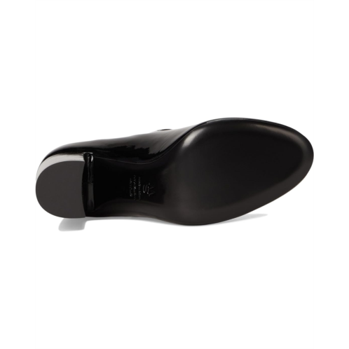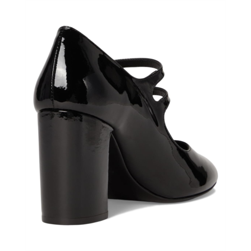 The Stuart Weitzman Posh 85 Mary Jane boasts a sleek almond toe silhouette with block heel and buckle adjustable dual strap closure. The footwear features glossy leather upper construction with cushioned footbed for all-day comfort.