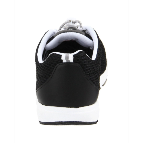 Machine washable mesh fabric upper with rubber toe cap and heel guard provides a breathable, durable exterior.