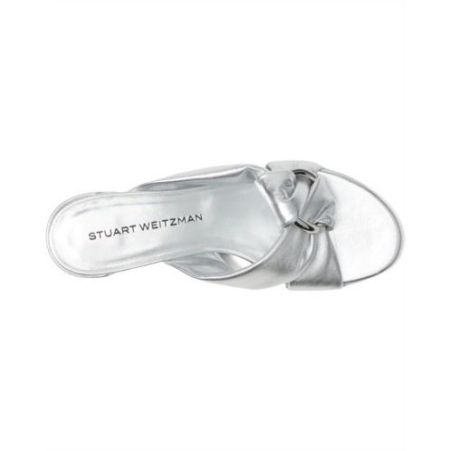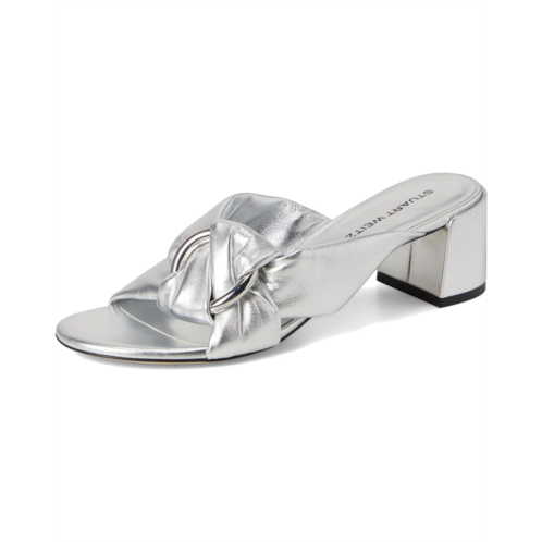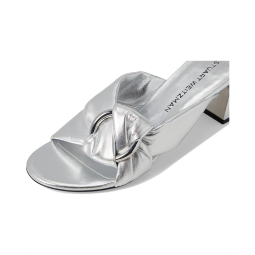 Prepare to turn heads donning the Stuart Weitzman Cece Block Slides 50. The knotted leather upper and goldtone ring detail add a touch of sophistication to your look. Crafted from beautiful mestizo leather and lined with plush lamb leather, these slides offer both style and comfort. Complete with leather insole and block heels for added support, these slides are perfect for any occasion with their chic open toe design.