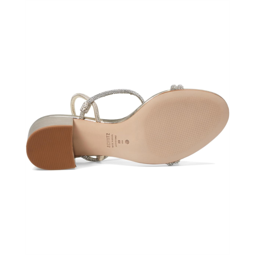 The Schutz Whiteley Block Sandals are intricately designed using clear rhinestone embellishments on the slim upper straps. This slip-on pair features mid-block heels, a backstrap closure, and an open round toe silhouette.