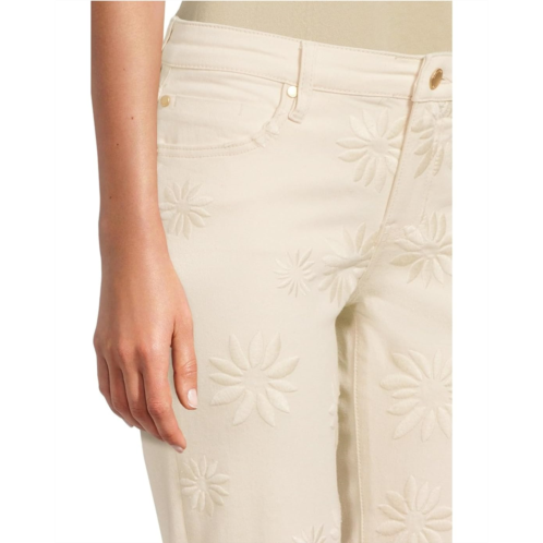Elevate your look with the Liverpool Los Angeles Hannah Crop Flare With Fray Hem 25.5' jeans featuring a frayed hem. Designed in a flared-leg silhouette with a mid-rise waist, these jeans are finished with a zip-fly, buttoned closure, flat front, and belt loops. They are cut from Ecru stretch denim fabric for all-day comfort and a better range of movement. These mid-rise jeans are styled with floral embroidery detail allover. Feel great and look amazing in this on-trend silhouette.