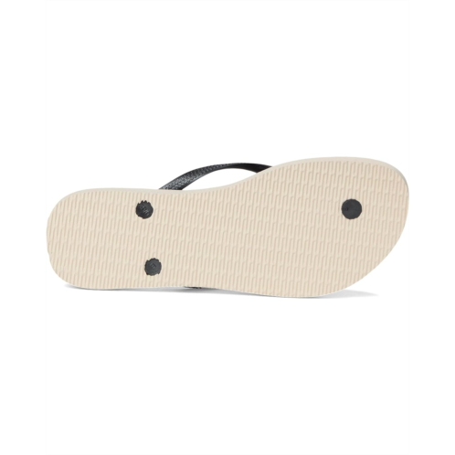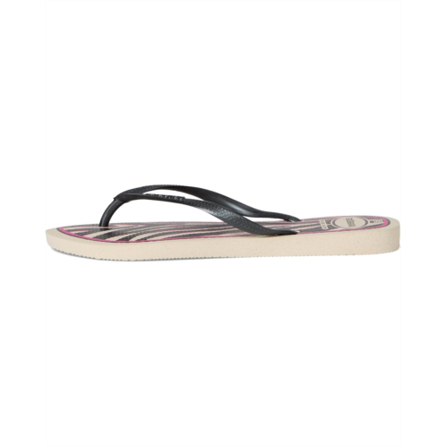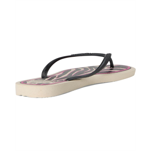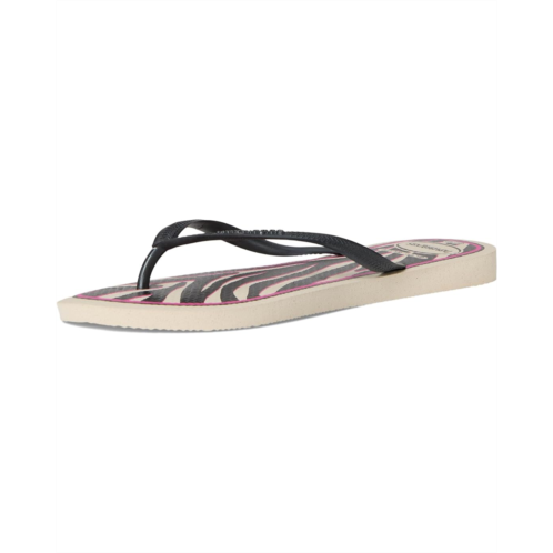 The iconic Havaianas Slim Animals Sandals are now for animal print lovers. They bring all the delicacy and charm of thin straps paired with a trend that never goes out of style. With a 'framed' animal print, these flip-flops feature a 100% rubber, non-slip outsole and metallic straps for an extra stylish touch. These slide sandals are made of a rubber upper, rubber insole, and natural rubber lining, making them ideal for everyday wear.