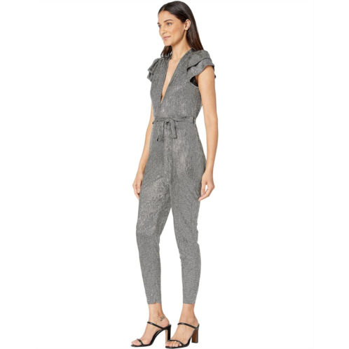 A glamorous metallic sheen highlights the Sabina Musayev Oscar Jumpsuit. Flutter sleeves pair well with pleated shoulders and a plunging V-neckline.