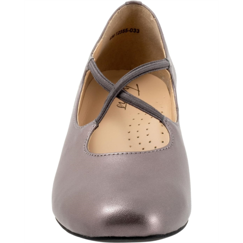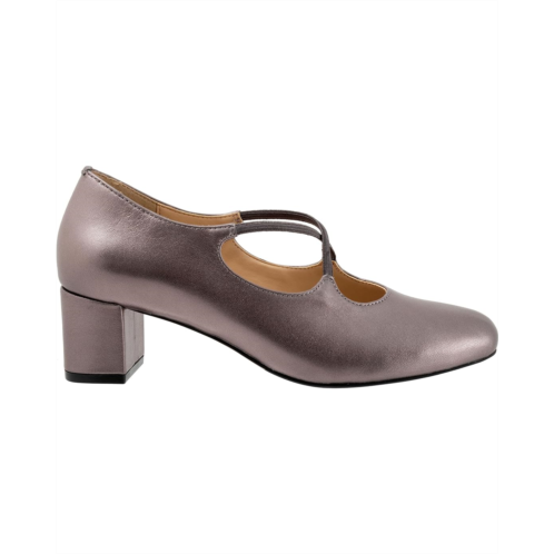 Exclusively brighten up your night look wearing the Trotters Demi. This pair of heels is designed with a crossover strap, block heel, and brand name embossed on the footbed. It also has a soft man-made nappa upper and a cushioned footbed with arch support.