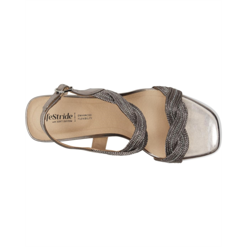 Shine with every step in these stunning LifeStride Charnelle block heels featuring rhinestone accents. Crafted from faux leather upper, this square toe style boasts a slingback strap with an adjustable buckle for a perfect fit. These heels are designed with linings made from partially recycled materials. Experience unparalleled comfort with trusted Soft System technology, providing unmatched cushion, support, and flexibility in every pair. The ultra-flexible, padded platform heel offers enhanced flexibility for effortless movement.