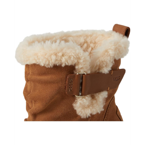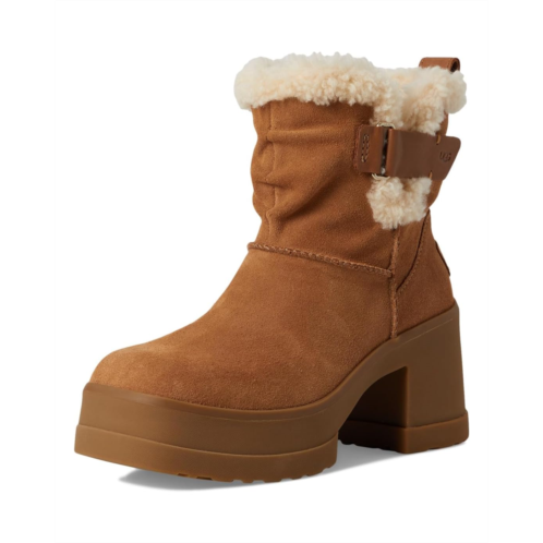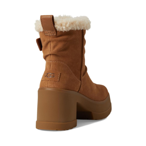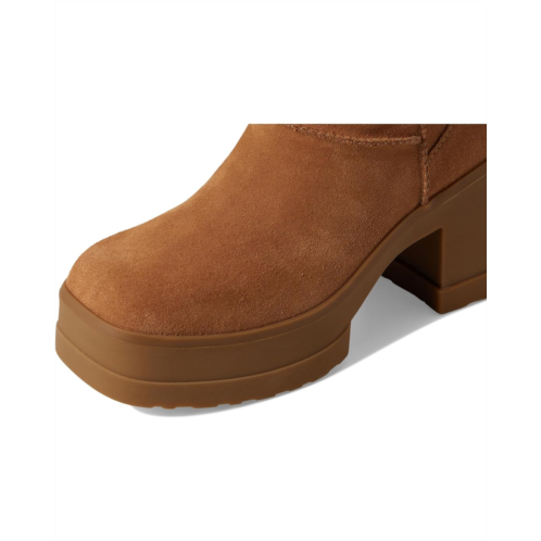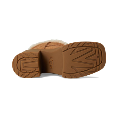 The Moxy Pull On takes the bold lug tread of the Brooklyn and infuses it with a rich mix of suede and leather. Steeped in UGG heritage, this boot has The Twin Seam details and a plush, curly sheepskin collar. It's boosted on a 3.2' platform and 4.5' heel made from lightweight rubber with an EVA fill.
