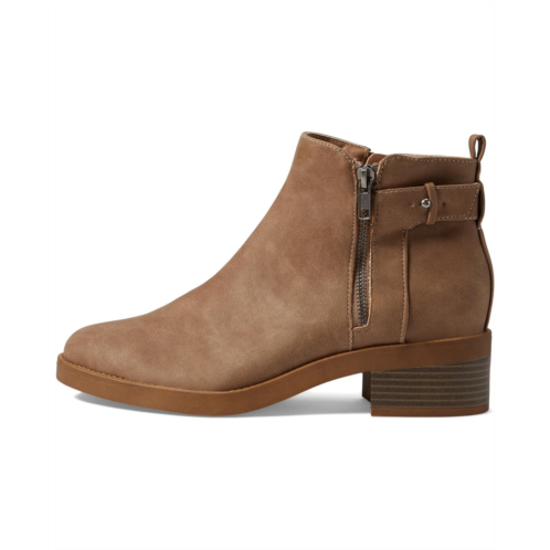 Zippered side closure and buckle detailing on the back.