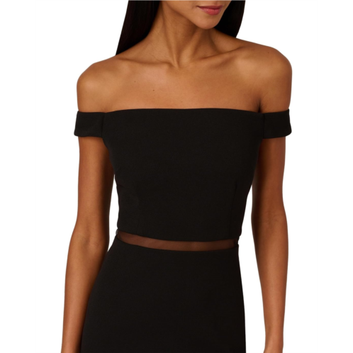 Show off on your next night out in this Adrianna Papell Knit Crepe Midi Dress. This party dress features an off-the-shoulder neckline, a fitted bodice with boning construction, and a mesh panel on the waist. The skirt is fitted and midi-length with sheer insets at the knees. Crafted from knit crepe, this off-the-shoulder dress has some stretch for a comfortable fit. A zippered closure on the center back completes this cocktail dress. A Trend-forward look for cocktail parties or formal weddings, this midi dress is a stunning look with heels and sparkling jewelry.