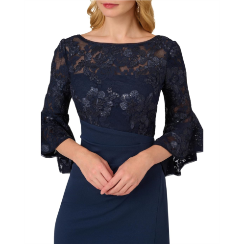Sequin infused lace is just one detail that makes this Adrianna Papell Floral Lace Combo Dress special. This sheath dress features a sheer lace bodice with boat neckline, sheer three-quarter bell sleeves, and a midi-length skirt with pleat details at the waist. Crafted from knit crepe fabric throughout, this three-quarter sleeve dress is overlaid at the bodice with lace embroidered with sequin florals. A sheer V-back and center zipper closure completes this cocktail dress.