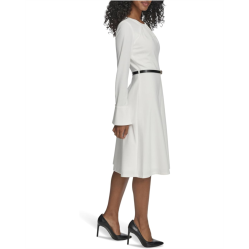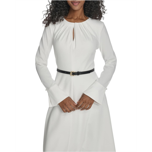 From the desk to dinner, maintain your effortless style in the Calvin Klein Long Sleeve Scuba Crepe Belted A-line dress. Featuring a round neckline with long sleeves, button closure cuffs, keyhole opening in front, and a back zipper closure.