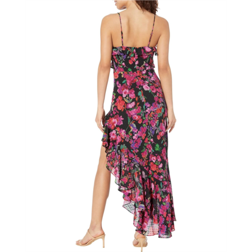 Walk in your feminine flair by styling this flowy floral print line and dot Mika Asymmetrical Dress finished with ruffled trims. This maxi dress features a V-neckline, adjustable straps, and zippered back closure.