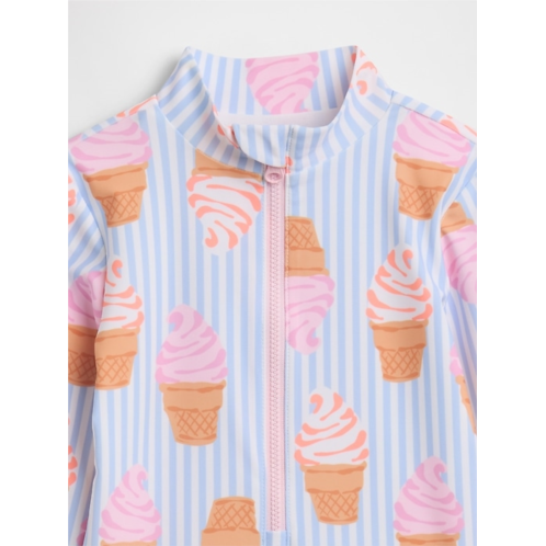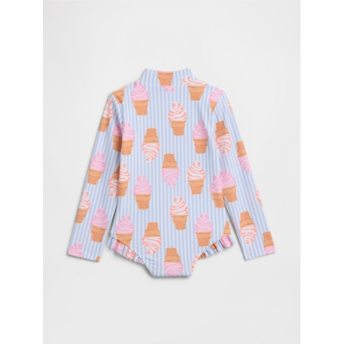 - Ruffle trim at elasticized leg opening (sizes 0-24M have snap closures).