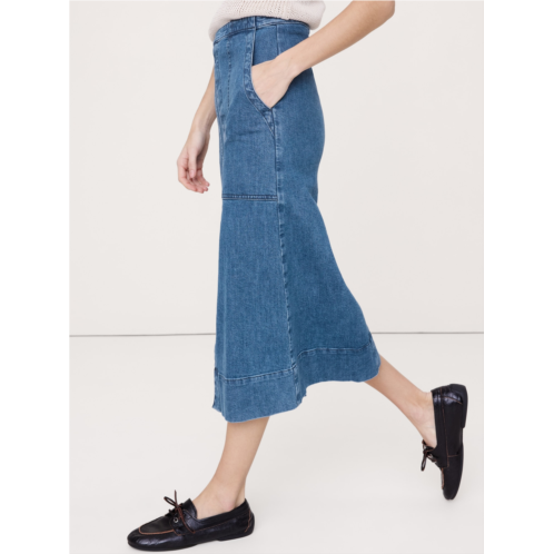 - We love a little denim midi skirt. Here, we added a front slit and cut it in a soft denim woven from certified Regenagri regenerative cotton.