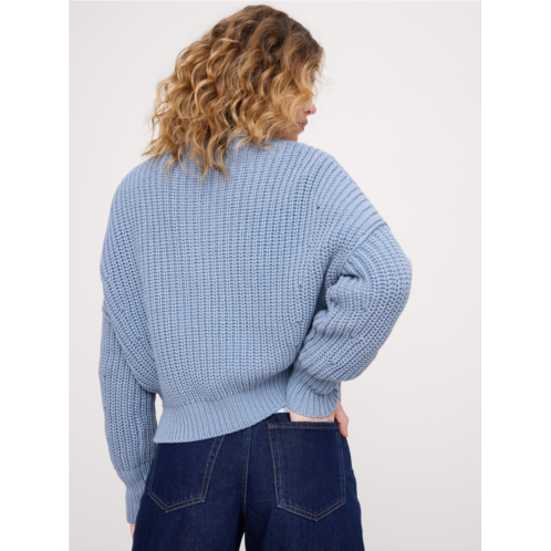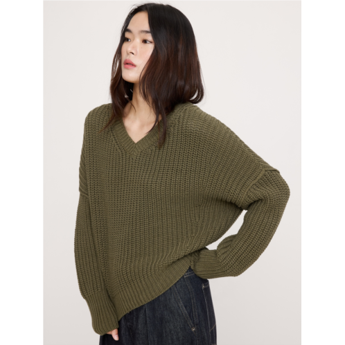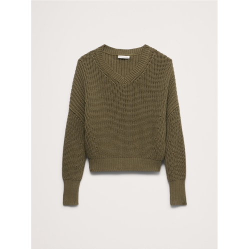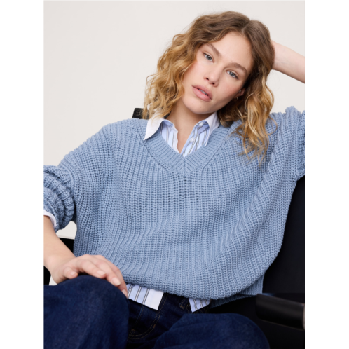 - We wanted to make the classic cotton V-neck feel fresh, so we updated the fit to a slouchy, dolman-sleeved silhouette and reached for a chunky cotton yarn we love because it's warm enough for winter, but light enough for spring and summer.