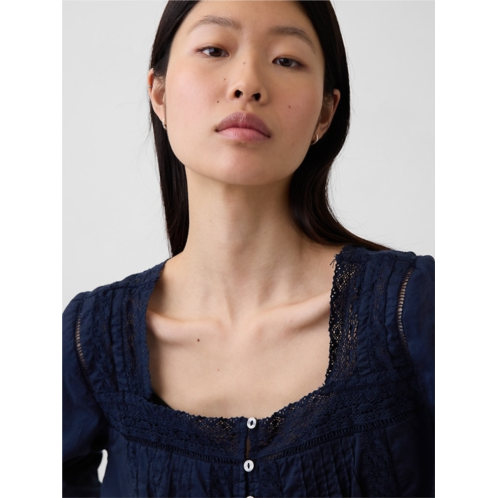 - Long sleeves with hidden snaps at shoulders to hold bra straps in place.