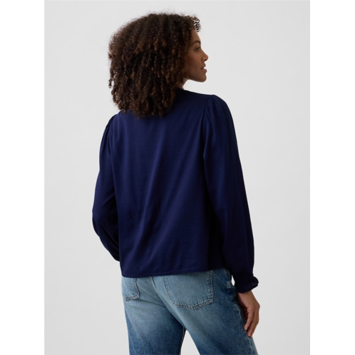- Dropped shoulder, long puff sleeves with elasticized cuffs.