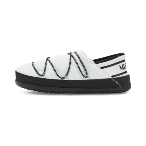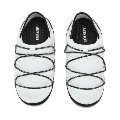 - The lounge-to-street revolution, Moon Boot Icon Slipper. Crafted with a premium leather upper, this slipper delivers a luxe feel with lasting durability, while the soft polyester lining and insole wrap your feet in all-day comfort. The pull-on design makes slipping in effortless, perfect for relaxed mornings or laid-back evenings. What truly sets this Icon apart are the laces arranged in irregular arches, giving the slipper a bold, expressive personality that feels fashion-forward yet functional. A synthetic rubber outsole adds reliable grip and flexibility, so every step feels steady and secure. Finished with contrasting stripes at the back for a subtle pop of style, this slipper proves that comfort doesn't have to be quiet.