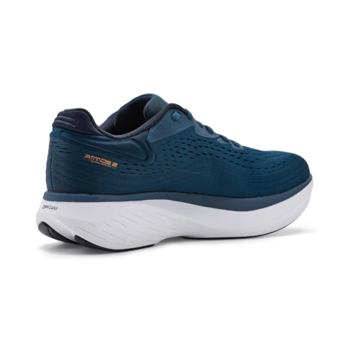 - The Topo Athletic Atmos 2 is a max-cushioned, neutral road shoe designed for plush comfort and reliable performance across daily training, long runs, and fitness walking. Its updated 40 x 35 mm platform features a ZipFoam midsole that delivers increased rebound for a soft yet energetic ride. A redesigned rubber outsole improves traction, slip resistance, and reduces weight, while the recycled upper ensures a breathable, secure fit with added visual appeal. Inside, the OrthoLite Performance insole provides a cushioned step-in feel. Made with polyester upper and lining, the Atmos 2 offers smooth transitions and lasting comfort.