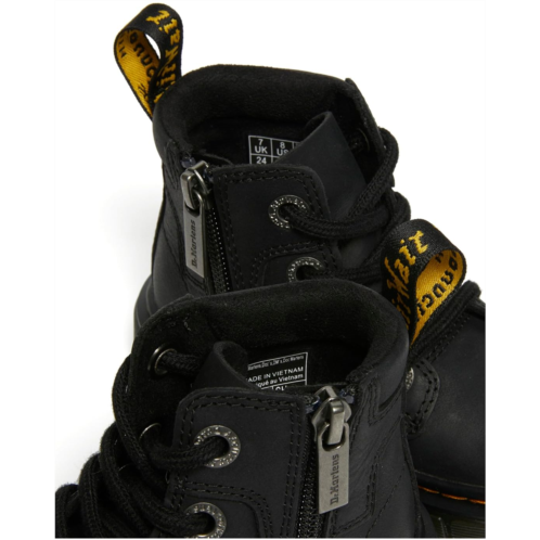 - The contemporary Dr. Martens Kid's Collection Raffe Boots give Docs attitude for the young rebel, while they are built on a wider ergonomic footbed and designed especially for growing feet. Featuring a rugged Wyoming leather upper with a subtle grain & oily finish and an Ethylene Vinyl Acetate insole with padded tongue & collar, these ankle-high boots offer premium comfort with every step. The lace-up closure with bold 6-eyelet design offers a secured fit and the scripted heel pull tab allows easy donning & doffing. These round toe boots are set on a chunky polyvinyl chloride outsole with an exaggerated tread and extra-flexible construction, with the iconic yellow stitch.