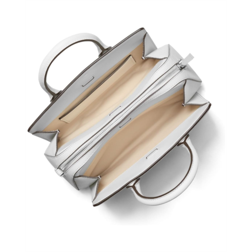 마이클코어스 - The MICHAEL Michael Kors Laila Small Satchel is made of durable polyvinyl chloride material, making it a stylish and practical choice for everyday use. It features dual shoulder straps for easy carrying, as well as a removable and adjustable crossbody strap for versatile wear. The interior compartment comes with a zippered closure to keep your belongings secure, while the two compartments with magnetic fastening provide easy access to your essentials.