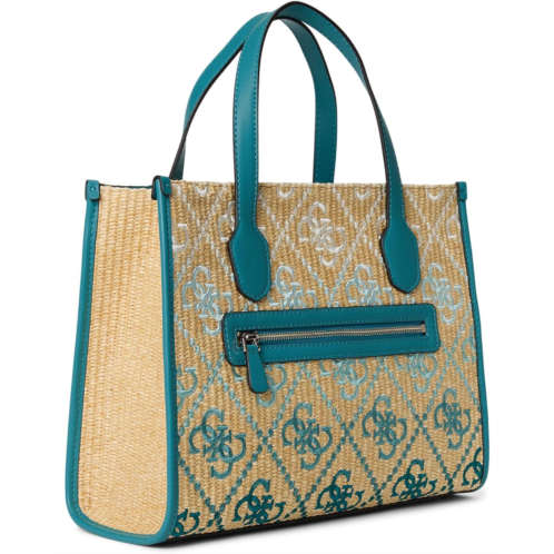 게스 - Take your style statement to the next level while keeping essentials safe in the GUESS Silvana 2 Compartment Tote Bag. With its raffia construction and adjustable/removable crossbody strap, the tote bag brings both durability and functionality. The zipper closure with external zippered pocket and two internal slip pockets allows organized and secure storage. The top handles make it conveneient to carry around and the shiny gold hardware adds to the aesthetics.