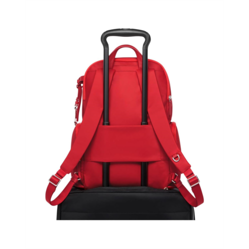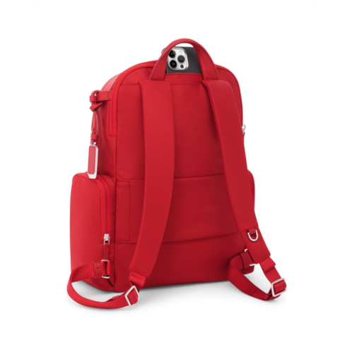투미 - Travel light and follow your dreams carrying the Tumi Celina Backpack. Crafted from nylon, this bag features double-zippered entry to main compartment, zippered laptop compartment, leather top handle, U-zippered exterior pocket, two zippered front pockets, zippered front entry to main compartment, zippered side pocket and double-zippered side water-resistant water bottle pocket. It has padded adjustable backpack straps with d-ring & loop compatible with brand accessories, quick-access phone pocket and detachable monogram leather charm. This bag also has zippered interior pocket, tumi tracer, two interior media pockets and leather card pocket.