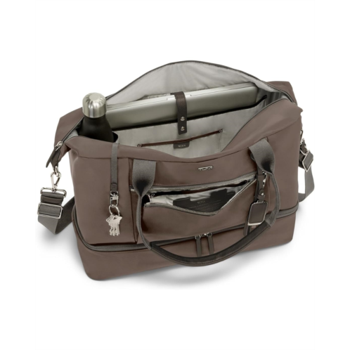 투미 - The Tumi Contine Weekender duffel keeps you organized and can be divided into two compartments with a quick zippered closure. It has a padded laptop compartment with a leather snap tab (fits up to a 13' PC or 14' MacBook screen) and a snap-to-hold zip-around lining that separates the top and bottom compartments. The removable, adjustable crossbody strap with D-ring is compatible with select TUMI+ accessories, while the loops are compatible with select TUMI+ accessories. Made from nylon, this duffle bag is designed with a zippered pocket, an open front, a TUMI tracer, a water-resistant water bottle pocket, a media pocket, a leather card pocket, a leather pen loop, and a key leash. The leather-trimmed shoulder straps, quick-access phone pocket, and top grab handle add to its functionality. Offering a zippered entry to the bottom compartment, it's the perfect bag for long weekends, work trips, and everything in between.